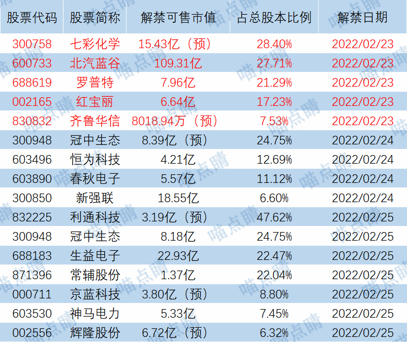 今天七彩化学、北汽蓝谷等有大额可售解禁。