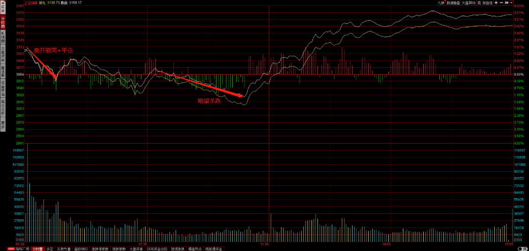 看今天日内分时是适用于暴跌次日公式的。昨天指数-5%的大阴线把多头都给打趴下了,信心极度低迷,上午又有一波高开获利盘、平仓盘、绝望盘的下杀,每一个下杀的低点其实都是买点,至于哪个位置是最低点,这个并不好说。