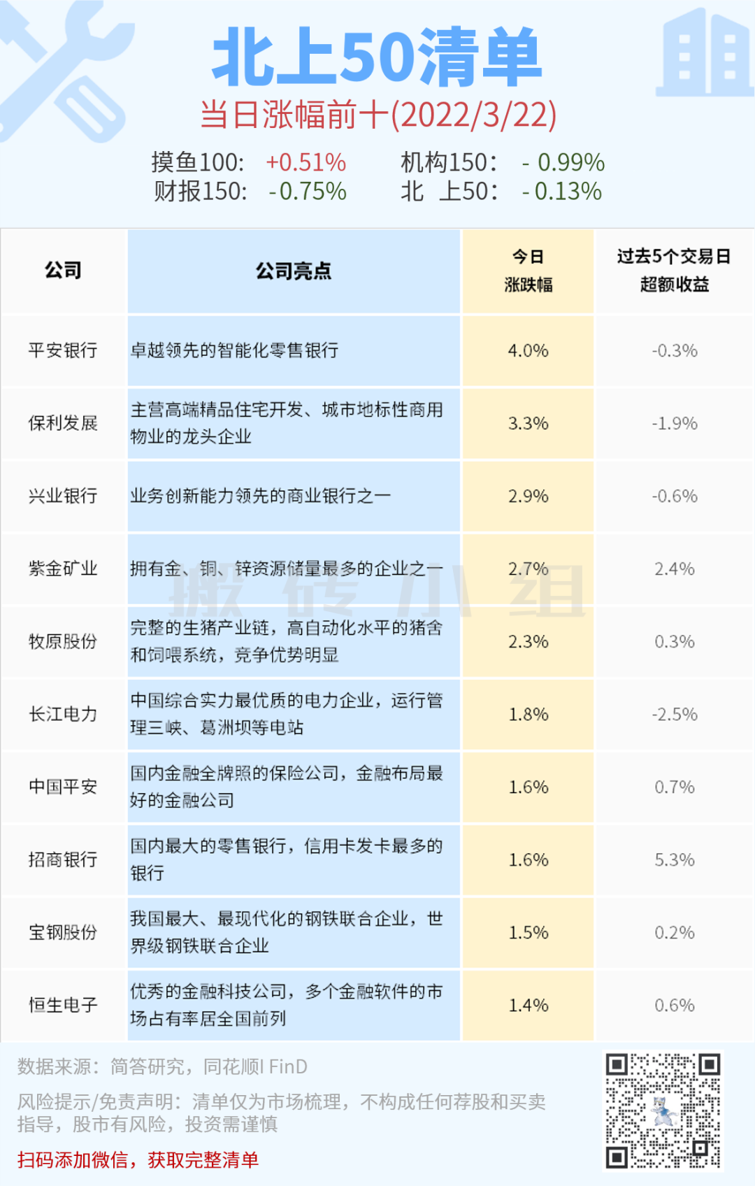 北上50今天涨在前面的都是传统价值,他们昨天的走势都挺弱的,不做过多解读,保持震荡观察。