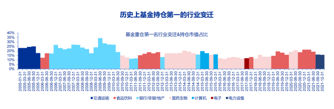 下面这张图是05年至今公募持仓第一行业的变迁,7个大行业轮流坐过王座,这张图非常直接地解释了市场没有YYDS。