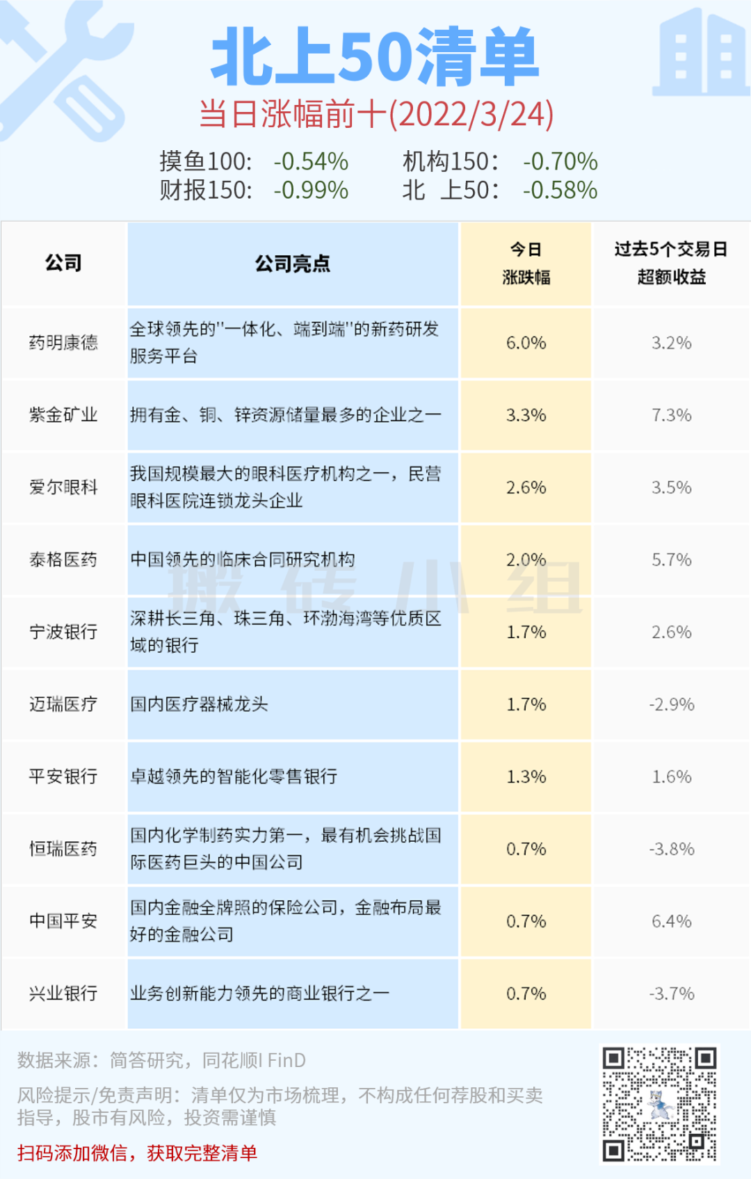 北上50榜单跟昨天差不多,连续两天医药跑赢市场。但是当前市场的持续性并不是特别好,连续涨两天以后要注意回调压力了。