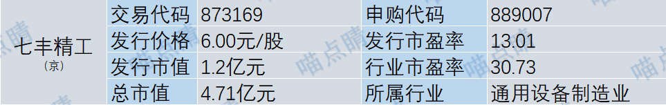 七丰精工主要从事紧固件的研产销,被评为2021年度浙江省专精特新中小企业与浙江省隐形冠军企业。七丰是北交所的新股,需要缴款申购,通常北交所的新股发行价和估值都不高,但比较难中签,中了肉量也不多,大伙可以根据自身资金情况,适当申购。
