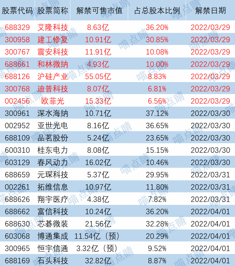 今天艾隆科技、建工修复等有大额可售解禁。