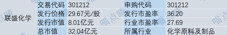 联盛化学主要从事医药中间体、农药中间体、电子化学品及化工溶剂为主的精细化学品的研产销。发行价、发行市值、估值都还可以,我正常申购。