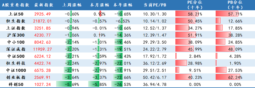 上周市场情况如图,还是以调整为主,加息缩表也好,疫情也罢,都是资本市场的扰动因素,短期还是要降低预期。但中长期不用悲观,看看上面指数的估值分位就能体会到,我最近复盘了很多指数的历史走势,得出的结论就是:一定要珍惜每一轮熊市。