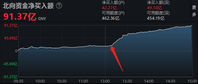 北上资金今天大幅度流入91亿,下午市场的枪就是他们开的,单日积极看多。