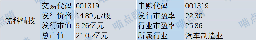 铭科精技主要从事精密冲压模具和金属结构件的研产销,主要为汽车、办公设备、电子产品等行业提供精密冲压模具和金属结构件。发行价和估值都不高,我正常申购。