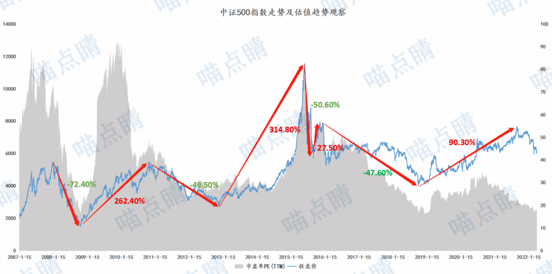至于市场,相信各种围绕惨烈的描述大伙都看了不少,我们就不接着比惨了,来看张老图吧。这个是中证500历史上全部走势的复盘,图中能得到两个信息点。