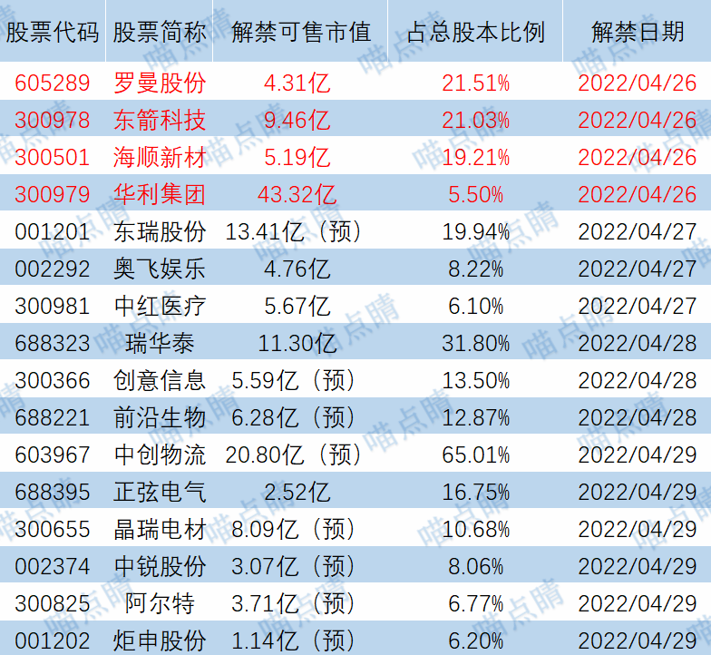 今天罗曼股份、东箭科技等有大额可售解禁。