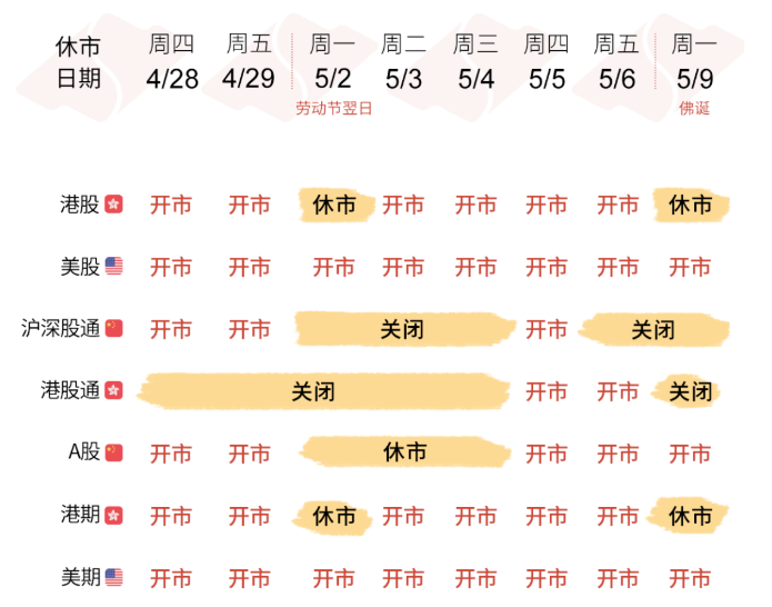 今天是五一假期前最后一个交易日了,假期共5天,A股是下周四恢复交易,但是这次假期还赶上了佛诞节,所以对港股通也产生了一些影响,上面是国信搞的一张图,还算清晰,大家可以做个参考。