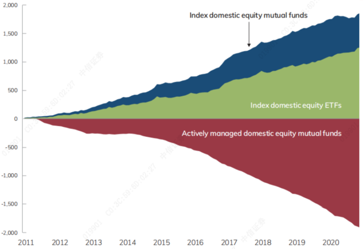 先看一张图,这是美国市场的一项数据对比,指数基金在近十年来获得了1.9万亿美元的净流入,而主动型基金承受了1.9万亿美元的净流出。外资一向被称作聪明投资者,而他们也用实际行动充分证明了自身的偏好。