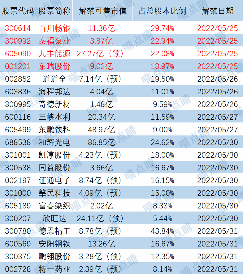 今天百川畅银、泰福泵业等有大额可售解禁。