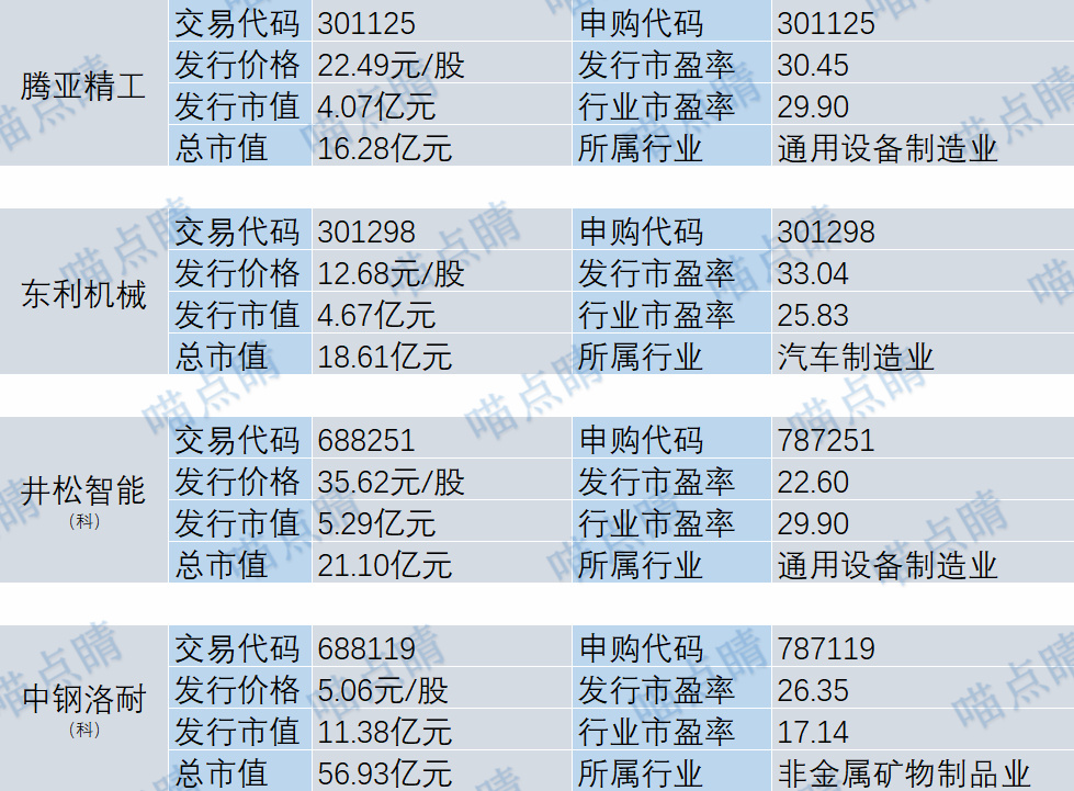 今天有四个新股,滕亚精工主营业务为射钉紧固器材和建筑五金制品的研产销,主要应用于建筑、装饰装修、安装施工等领域;