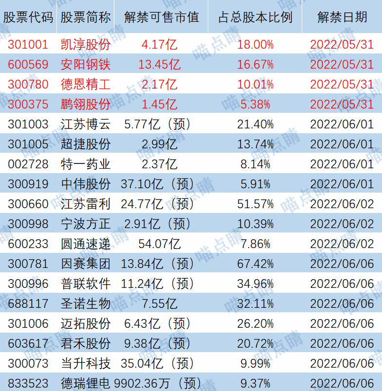 今天凯淳股份、安阳钢铁等有大额可售解禁。