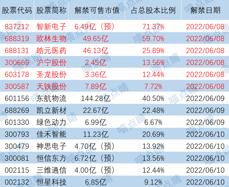 今天智新电子、欧林生物等有大额可售解禁。