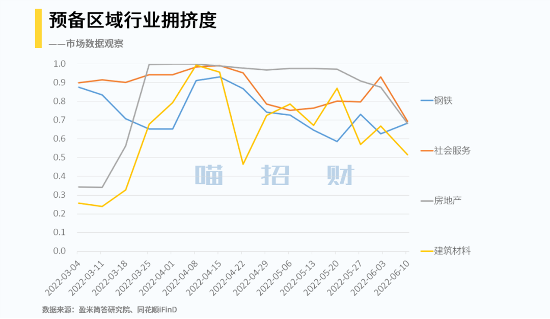 预备区域:50%<=拥挤度<70%。处于这个区域的行业拥挤度刚上50%,市场开始有资金关注,但是还没有出现特别强的赚钱效应。这个区域要观察哪些行业拥挤度在提升,然后去寻找背后的基本面或题材逻辑。上周只有钢铁是上升的,市场交易的是细分的特钢方向。