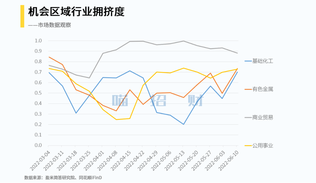 机会区域:70%<=拥挤度<90%。处于这个区域的行业开始有热钱关注,但还没有到特别热的程度,在这个区域内的行业容易走出趋势。这个区域跟预备区域一样,寻找拥挤度上升行业的推动逻辑。比如上周提升的是化工、有色和公用事业,最近交易热络的磷、锂、三氯氢硅都在前两个方向内。