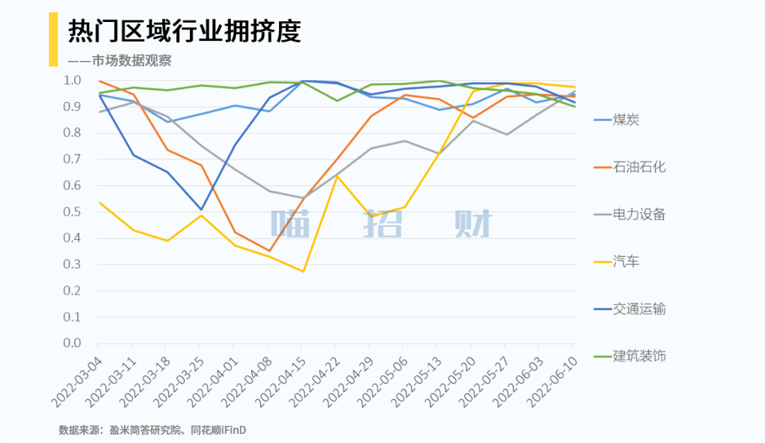 热门区域:拥挤度>=90%。在这个区域内的行业容易伴随着拥挤度的提升而暴涨,拥挤度的下降而暴跌,本质上是流动性驱动的行业贝塔行情,这个区域重要的就是跟趋势看图。这一轮趋势最强的煤炭、电力设备、汽车等都在这个区域内。