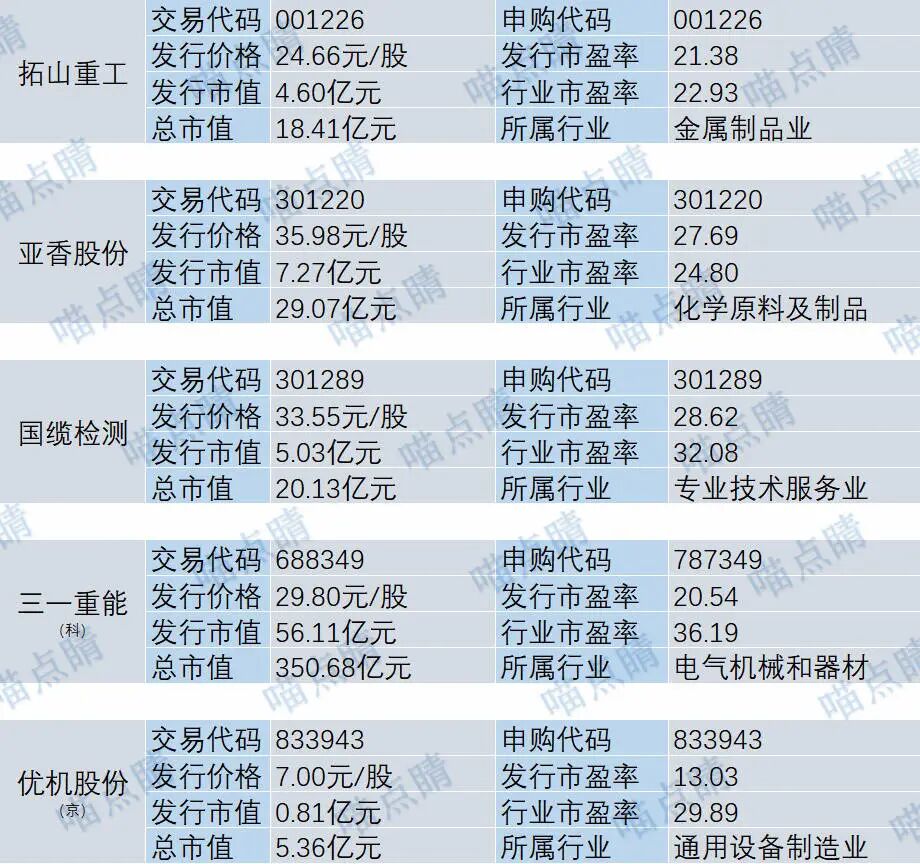 今天有五个新股,拓山重工主要从事工程机械零部件及总成的研产销,产品主要应用于工程机械领域;亚香股份主要从事香料的研产销,是国内中高端香料主要生产企业之一;