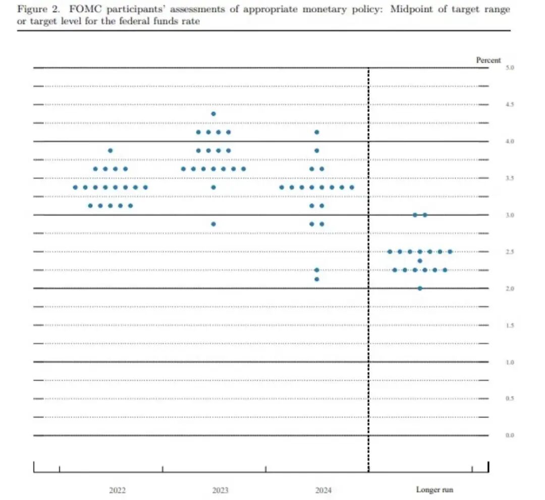 在谈到经济时,老鲍头称当前没有迹象显示美国有衰退迹象,当前经济有能力应对紧缩的政策。6月的点阵图显示,2022、2023、2024年底联邦基金利率预期中值分别升至3.4%,3.8%,3.4%,预计在2024年开始降息。