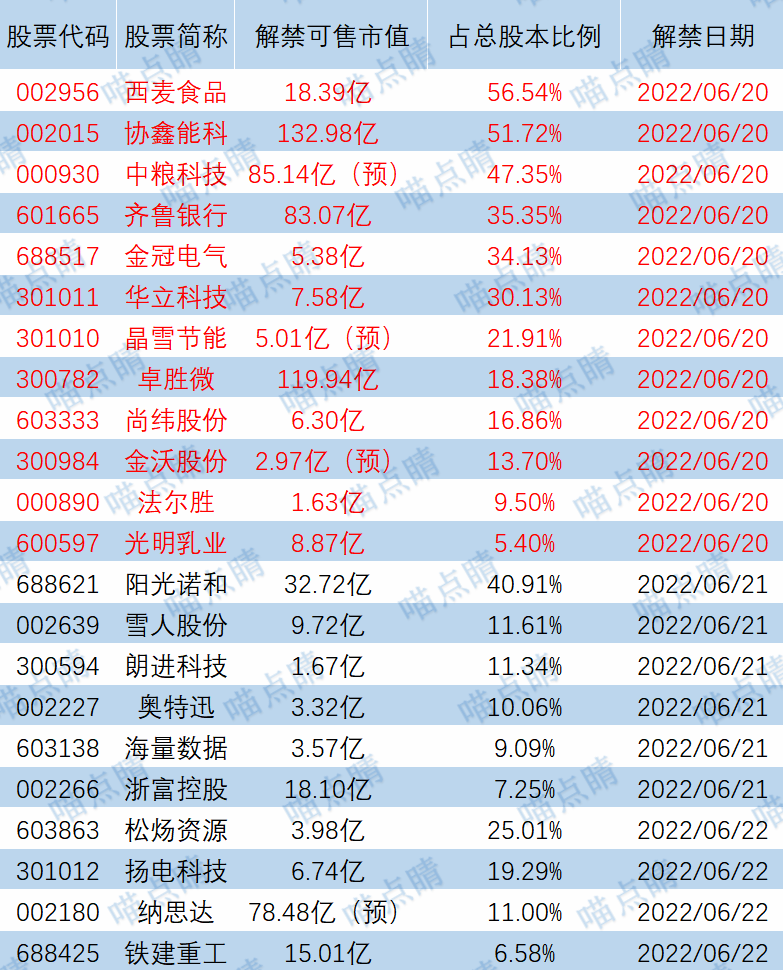 今天西麦食品、协鑫能科等有大额可售解禁。
