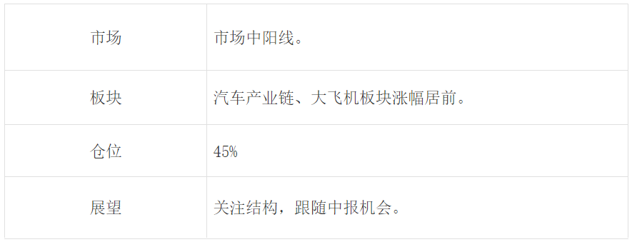 策略上,继续保持仓位跟随市场,结构上要注意节奏,进入加速的看图交易,配置方向继续面向中报进行调仓。
