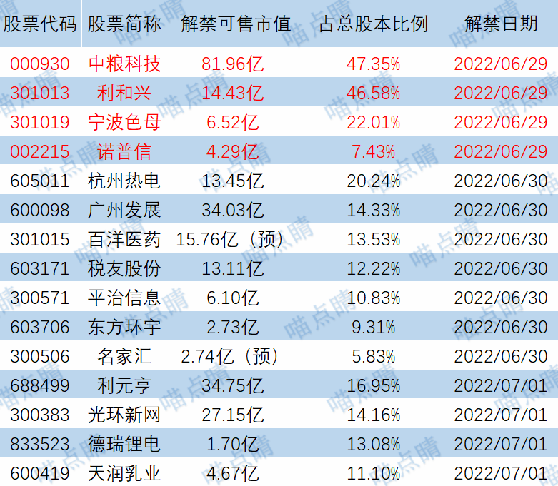 今天中粮科技、利和兴等有大额可售解禁。