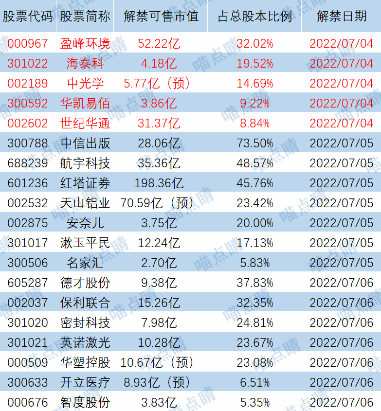 6、数据显示,7月解禁规模预计为4844亿元,达到年内小高峰。其中科创板由于首批上市企业已满三年,7月解禁规模高达2645亿元,澜起科技、中微公司、中国通号、杭可科技,解禁规模均超200亿元。