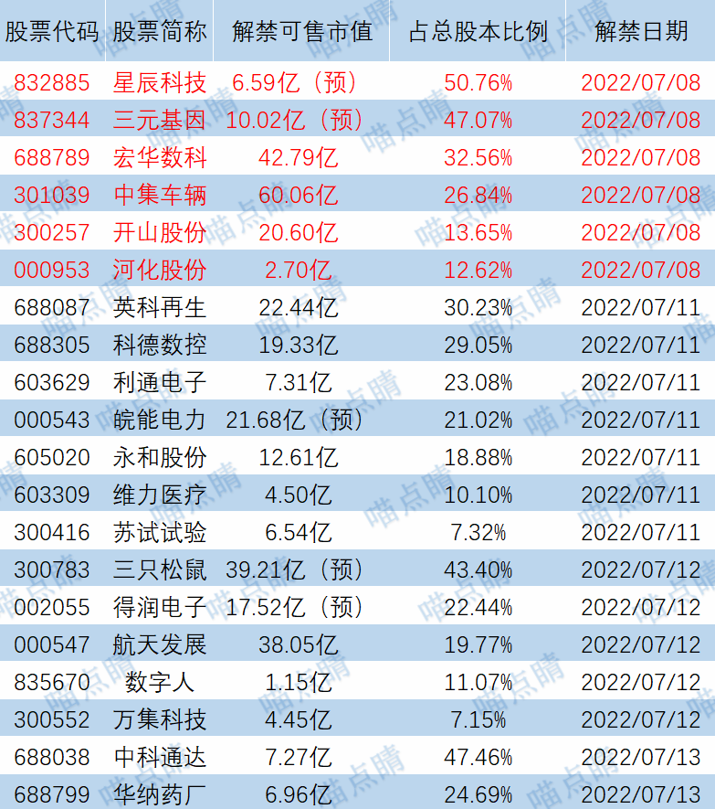 今天星辰科技、三元基因等有大额可售解禁。