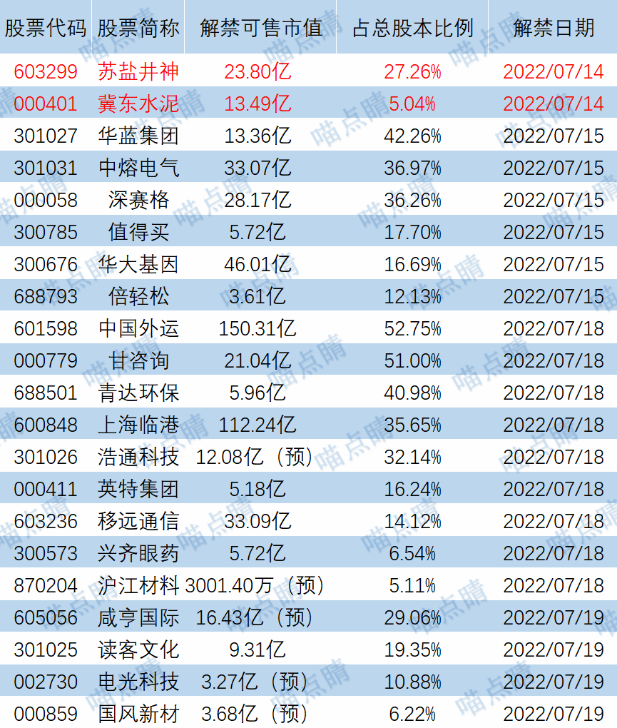 今天苏盐井神、冀东水泥有大额可售解禁。