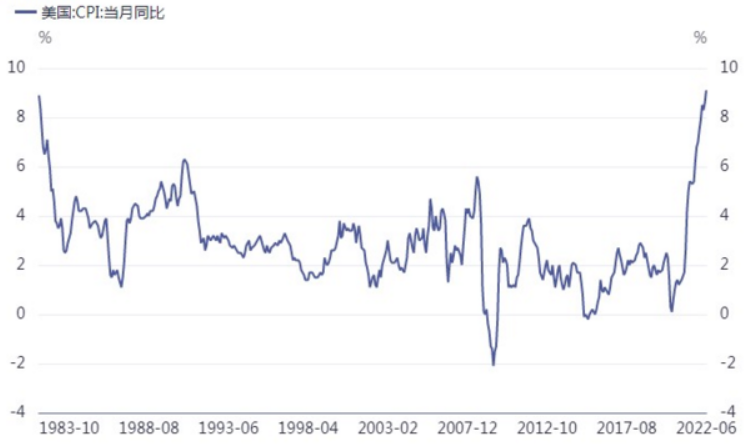 如果说非农数据使得7月加息75bp板上钉钉的话,那么昨晚披露的美国6月CPI数据,就相当于在这个板子上又钉了一个板子。。数据显示,美国6月CPI同比+9.1%,这一惊人的数字一举创造了40年以来的最大增幅,可以看下图感受一下这凌厉的势头。