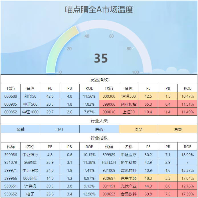 喵点睛全市场温度为35,比昨天高了一分,整体依然处在相对便宜的阶段。重点跟踪的宽基和行业指数,所属性价比区间未发生变化。