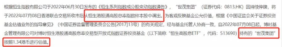 那么问题来了,成分股被踢出指数,但是ETF由于成分股停牌无法在二级市场卖出,所以依然持有。为了解决这种问题,基金公司通常是提前计提亏损。比如停牌前4.42港元的世茂,被基金公司按照1.34港元进行了重新估值,相当于直接打了3折。。