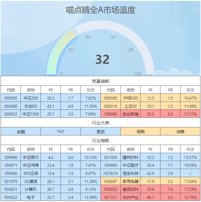 在上周市场普跌过后,喵点睛全A温度已经降到32度,朝着冷清便宜的方向又走了一步,行业方面,处在低估定投区的品种性价比进一步夯实。之前快速反弹时,一些跟投的朋友还在惆怅没有收集够筹码,而现在又快回到遍地黄金的状态了。