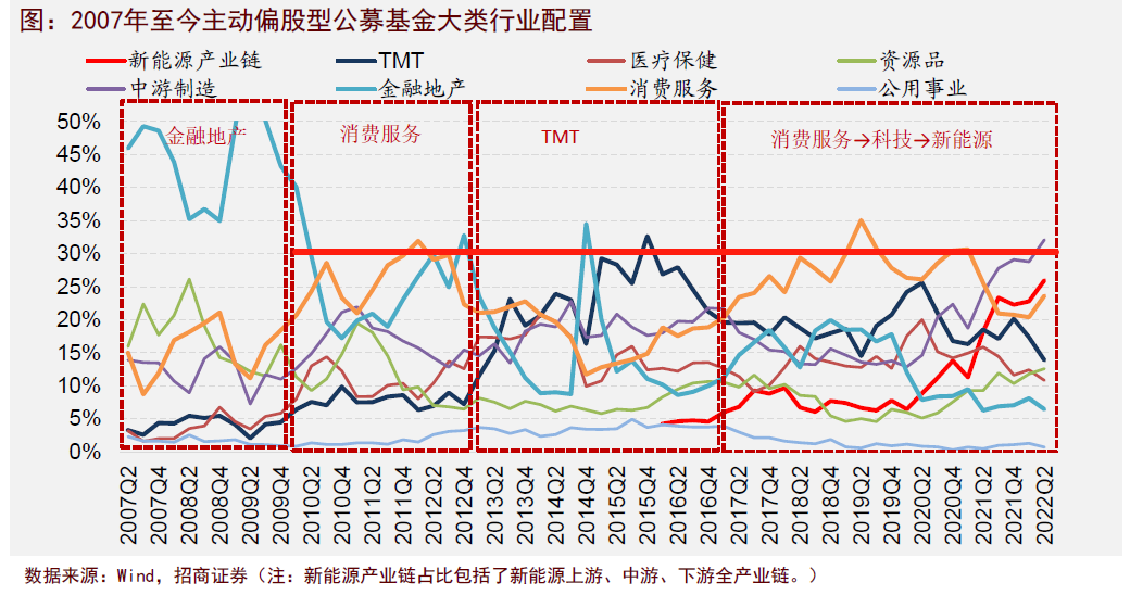 3、从大类资产上看,新能源产业链的配置还在继续上行,减仓的方向主要在TMT、医疗和金融地产上。