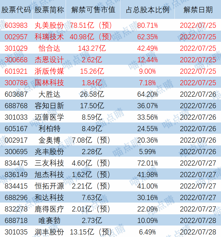 今天丸美股份、科瑞技术等有大额可售解禁。