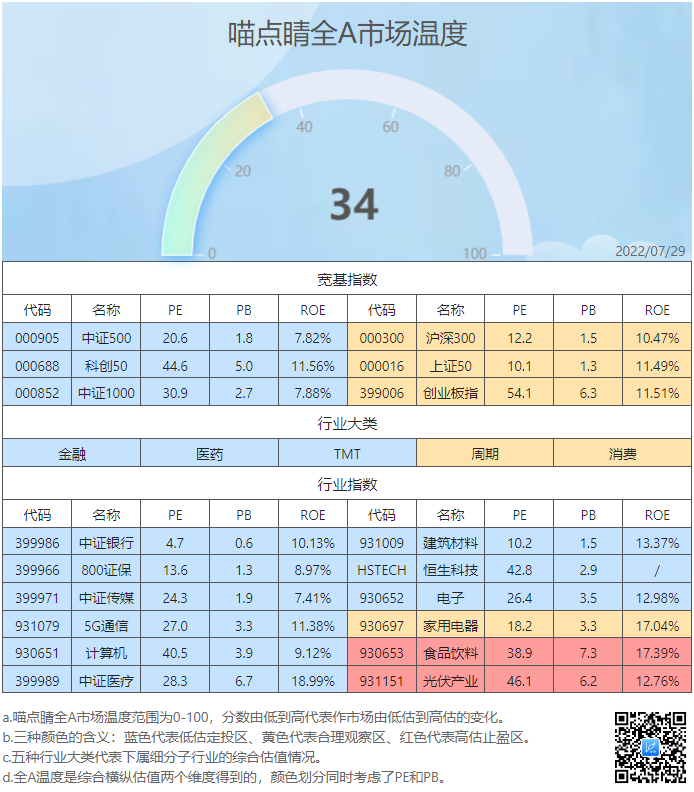 最近市场反复揉搓,市场温度变化不大,依然是处在30多分的状态,行业的分数区间也无甚变化,整体依旧是高性价比阶段。关于这个表格,大家有不懂的可以去看看底部的用法说明,其实还是比较简单的。