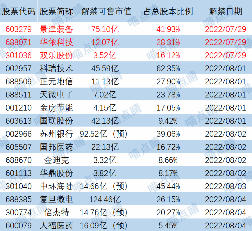 今天景津装备、华依科技等有大额可售解禁。