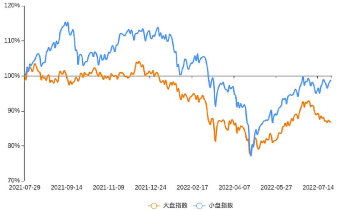 市场展开反弹,行情依然沿着”成长好于价值,小盘优于大盘”的路径在展开,内在逻辑最近也讲了多次,不再赘述。下图是今年以来大小盘指数的对比走势,可以看出,今年7月的这一波分化形成的剪刀差,已经几乎达到了去年的峰值。