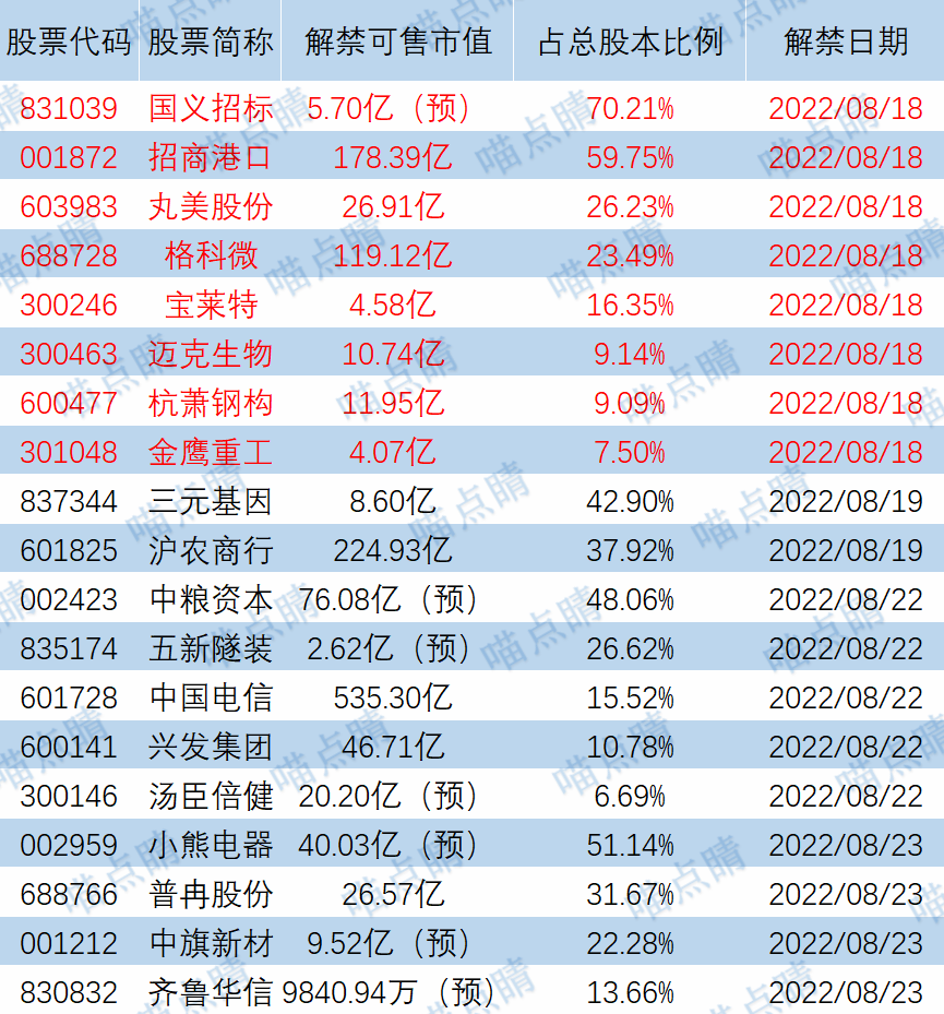 今天国义招标、招商港口等有大额可售解禁。