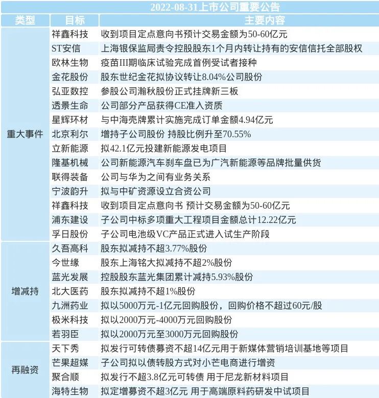 3、富时罗素宣布,富时中国A50指数将纳入亿纬锂能、中国石油、陕西煤业;删除海螺水泥、中国太保、片仔癀,该变更将于9月16日收盘后生效。加入指数主要能带来部分流动性,对长期走势影响不大。
