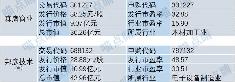 森鹰窗业专注于定制化节能铝包木窗的研产销,主要产品包括节能铝包木窗、幕墙及阳光房;邦彦技术致力于为各级各类指挥所、通信枢纽和通信节点提供信息通信系统级产品。今天这两个发行价和估值都可接受,我正常申购。