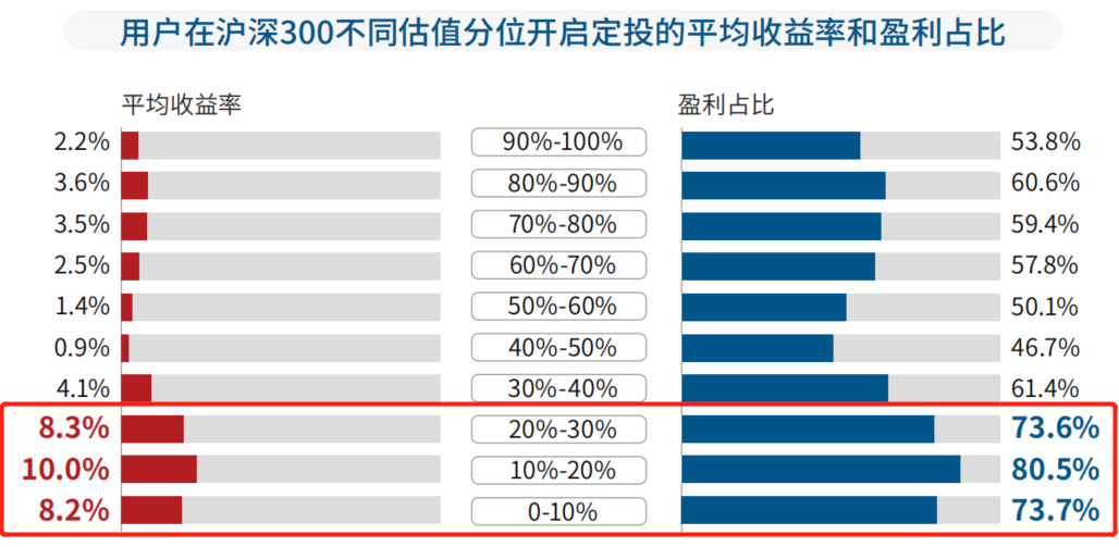 当然,估值便宜并不代表会立马上涨,它刻画的更多是赔率与胜率的维度,可以理解为在此阶段介入,赚钱的概率和空间都会更好一些。从下图的数据也能看出,在估值分位不到30%的时候开始定投,无论收益率还是胜率都是更为突出的。