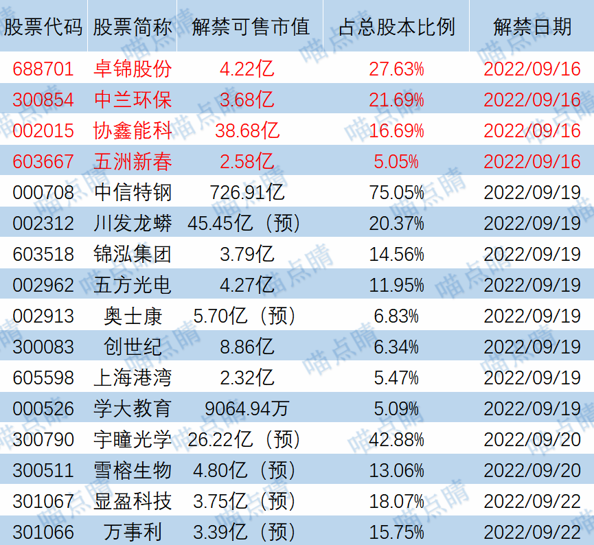 今天卓锦股份、中兰环保等有大额可售解禁。