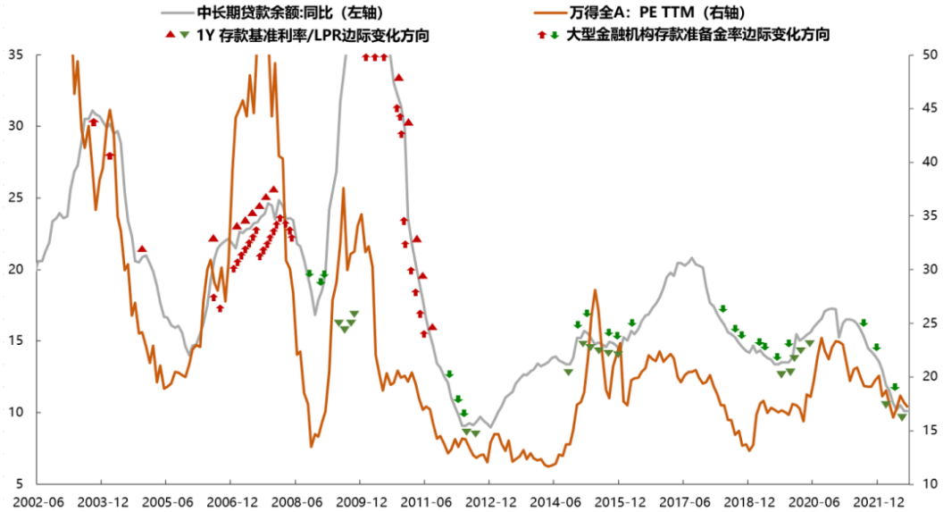 复盘过去,这一数据的同比增速和全A的估值走向几乎一致,这倒不难理解,因为中长期贷款的表现很大程度上决定了经济,尤其是传统经济方向的业绩表现。