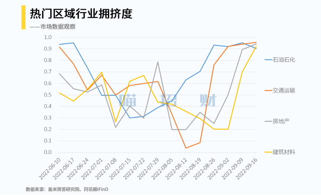 热门区域里已经没有新能源和煤炭了,反而是地产和建材出现在了这块。但在全市场流动性下行的背景下,行业拥挤度提升的意义并不大。