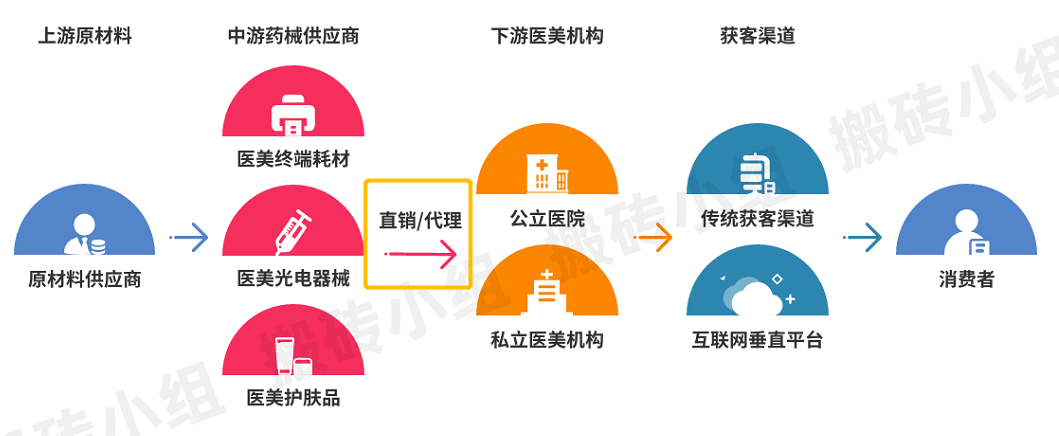 由于该传言未经证实,细节不多聊,大体意思就是要整治医美中上游的供货渠道,尤其是机构端,打击返佣等产业链中的不公平竞争行为,也就是下图中我标黄框的环节。