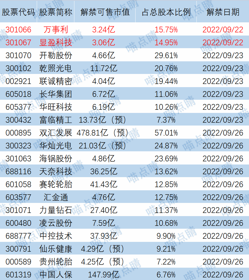今天万事利、显盈科技有大额可售解禁。