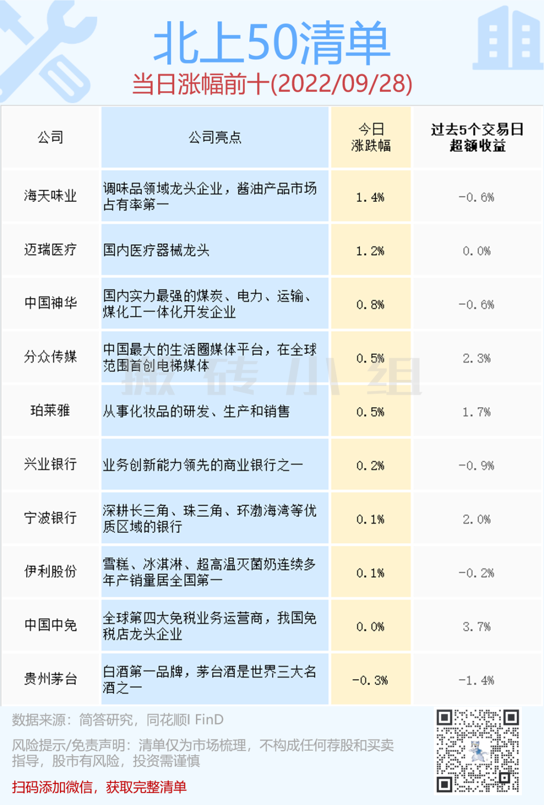北上50榜单整体弱势,不过茅指数成分表现都还稳定,是一个好的风向标。