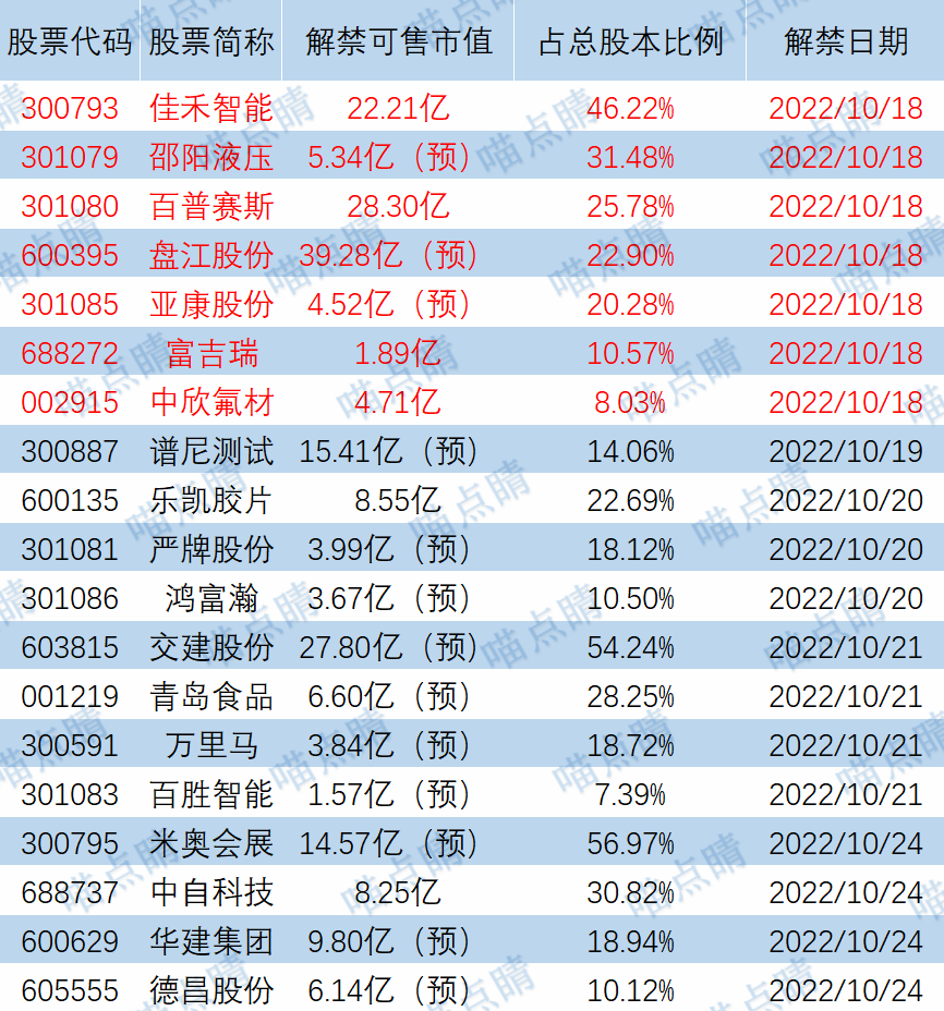 今天佳禾智能、邵阳液压等有大额可售解禁。